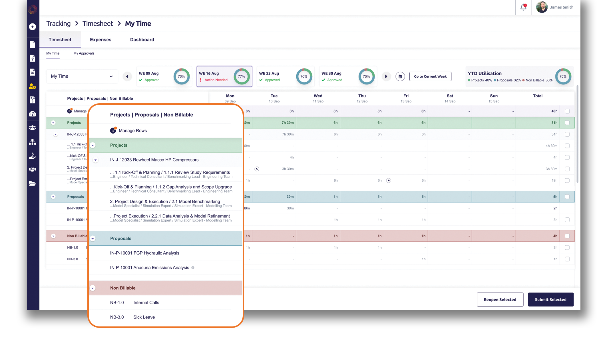 Our unified approval interface lets you see pending and approved submissions all in one place, streamlining your workflow. With a single click, you can approve or reopen submissions, instantly notifying team members if updates are required. Handle multiple submissions at once with bulk approvals, saving valuable time, while real-time budget visibility by work package gives you a clear snapshot of hours booked versus remaining.